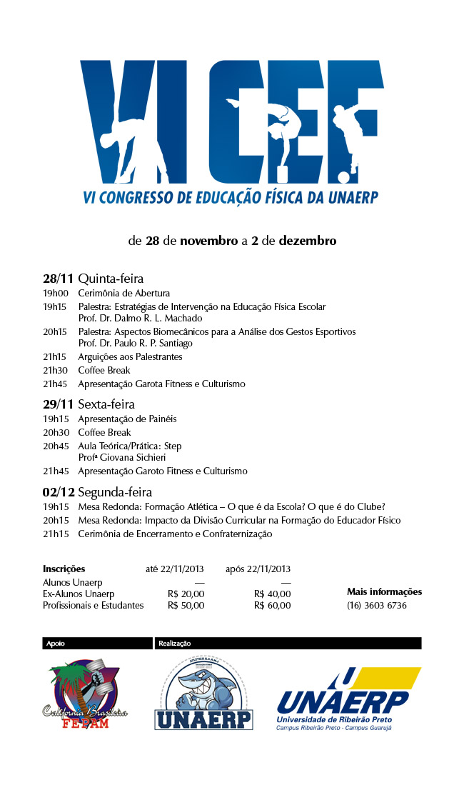 A Unaerp realiza o VI Congresso de Educação Física de 28 de novembro a 02 de dezembro. O evento, voltado para estudantes e profissionais da área, acontece à noite, a partir das das 19h, e conta com palestras, aulas práticas/teóricas, apresentações e mesas redondas.