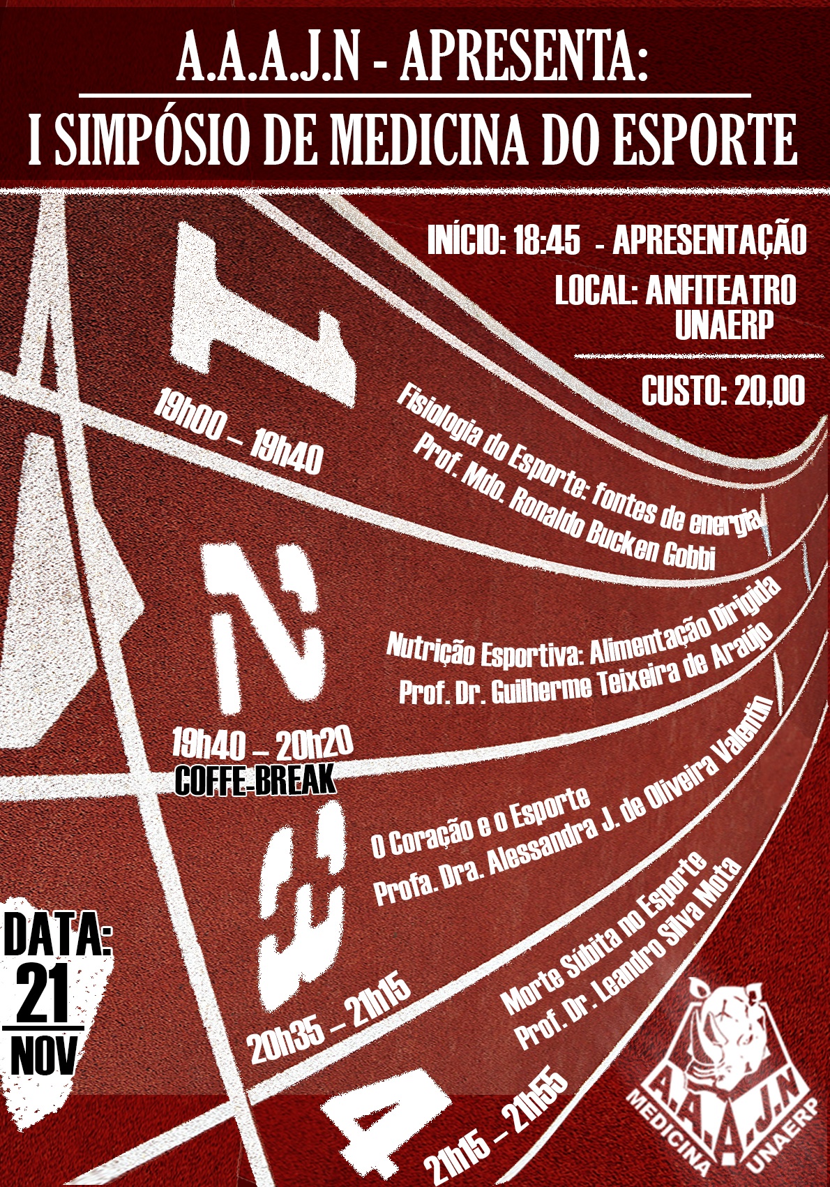 A Associação Atlética Acadêmica Jarbas Nogueira - A.A.A.J.N da Unaerp realiza no próximo dia 21 de novembro o I Simpósio de Medicina do Esporte, no Teatro Bassano Vaccarini. O evento é voltado para estudantes da área da saúde e interessados na área esportiva.