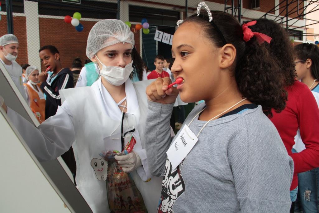 Na ação “Mundo mágico para seu sorriso” crianças recebiam instruções para escovar os dentes corretamente