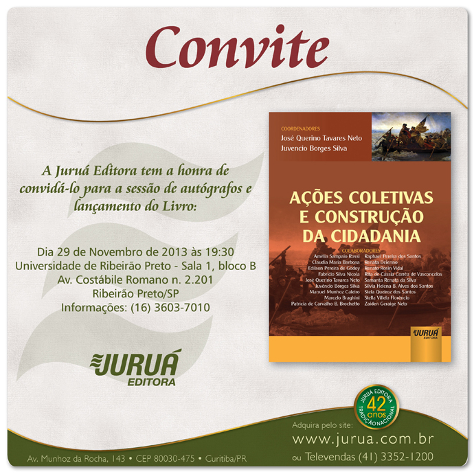 O livro "Ações Coletivas e Construção da Cidadania", uma coletânea de artigos desenvolvidos em momentos acadêmicos, discussão e análises em salas de aulas do Programa de Mestrado em Direito da Universidade de Ribeirão Preto - Unaerp, será lançado no próximo dia 29 de novembro na Unaerp.