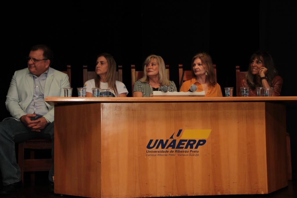 Compuseram a mesa de abertura coordenadoras da Diretoria de Ensino, Pesquisa e Extensão da Unaerp, a coordenadora do Comitê de Ética em Pesquisa e o coordenador do Programa de Mestrado em Direito e do curso de Direito da Universidade