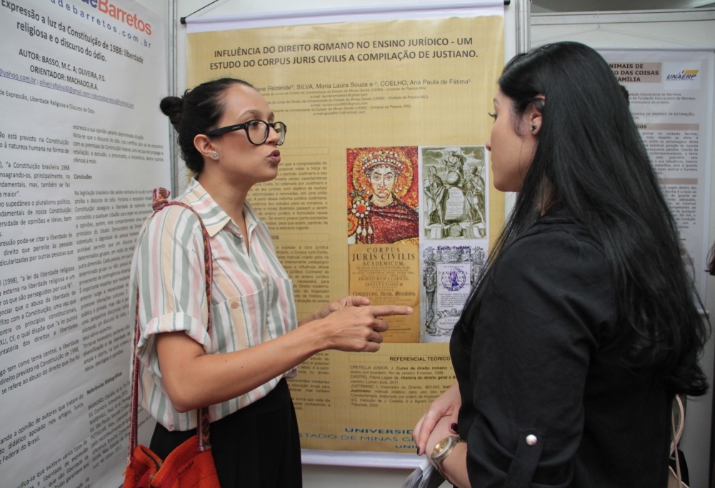 A estudante do curso de Direito da Universidade Estadual de Minas Gerais (UEMG), campus de Passos, Lauriane Rezende Madeira apresentando trabalho para uma das avaliadoras do Congresso