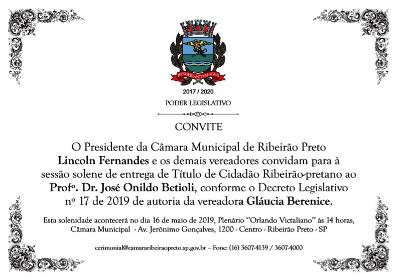 O docente do curso de Medicina da Unaerp, professor José Onildo Betioli Contel, vai receber o título de cidadão ribeirão-pretano em solenidade no dia 16/05, às 14h , na Câmara Municipal de Ribeirão Preto, situada na Rua Jerônimo Gonçalves, 1200.