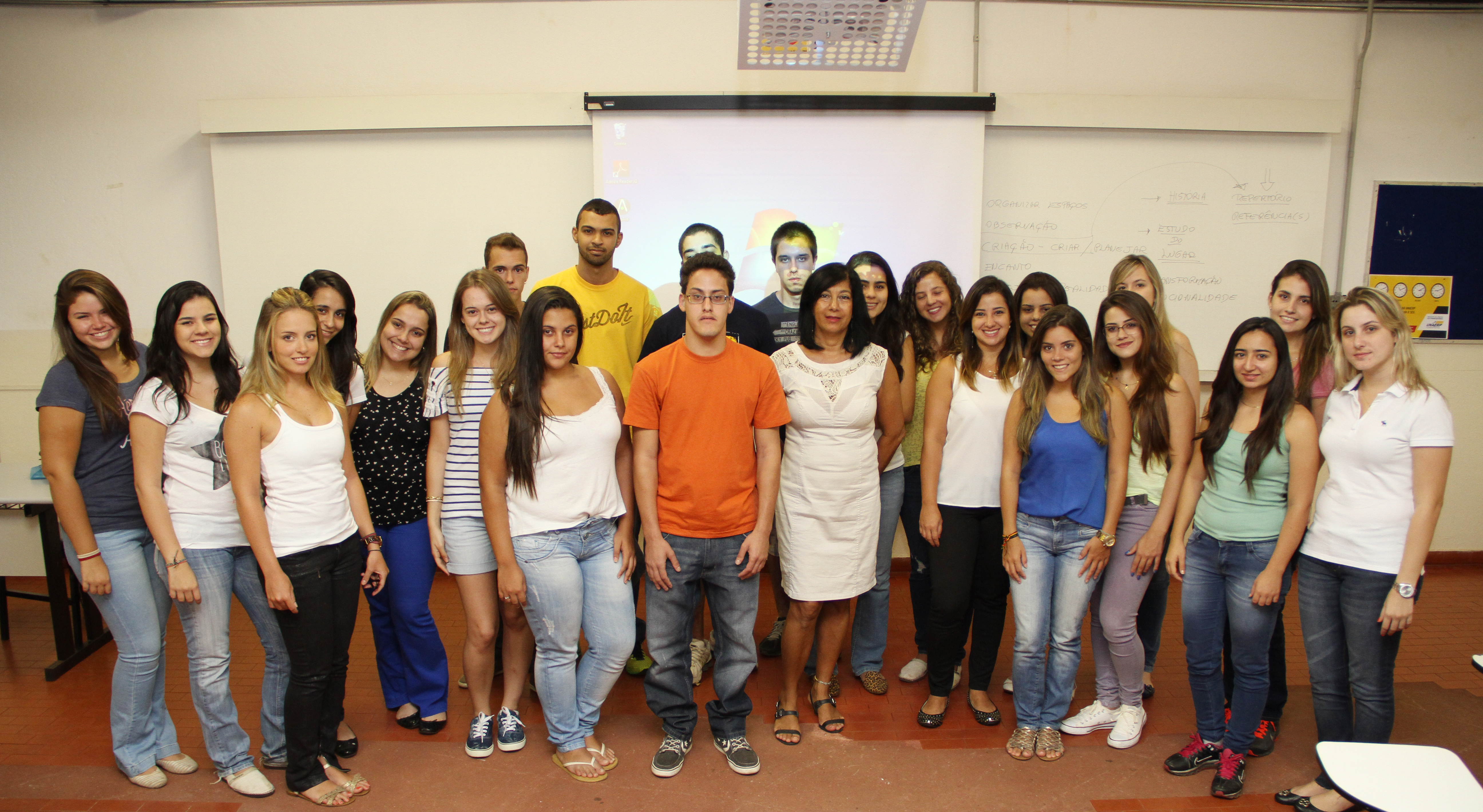 A coordenadora de Arquitetura e Urbanismo, professora Ruth Montanheiro Paolino (ao centro), e os alunos da primeira turma do curso