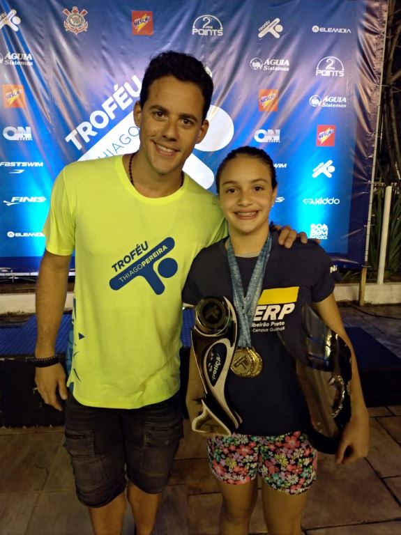A atleta parceira, Lara Capodifoglio, com o medalhista olímpico, Thiago Pereira