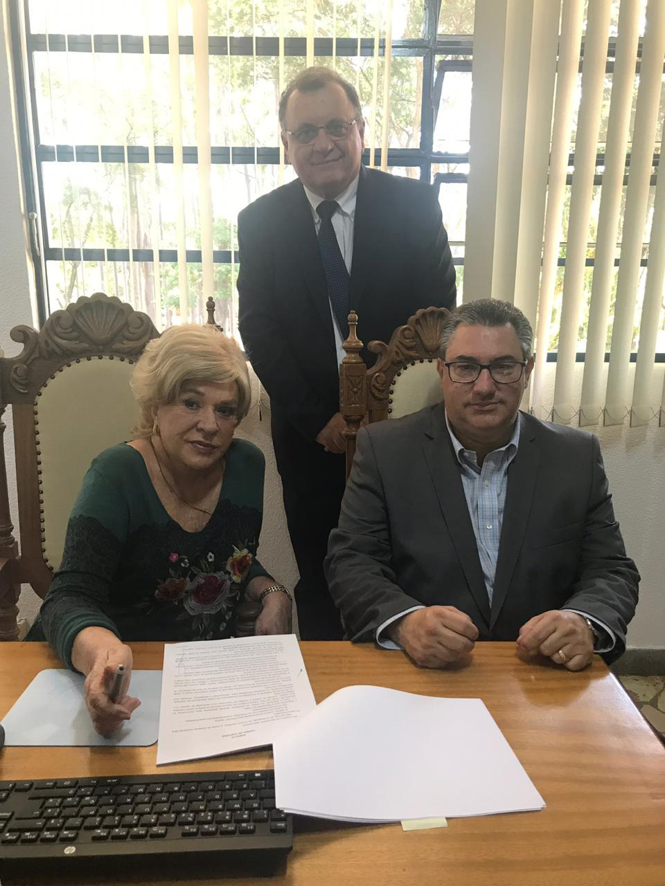 Assinatura do convênio no campus Ribeirão da Universidade. Da esquerda para a direita: a reitora da Unaerp, professora Elmara Bonini, o coordenador do curso de Direito da Unaerp, professor Sebastião Sérgio da Silveira, e o representante do TJSP, o juiz Guacy Sibile Leite