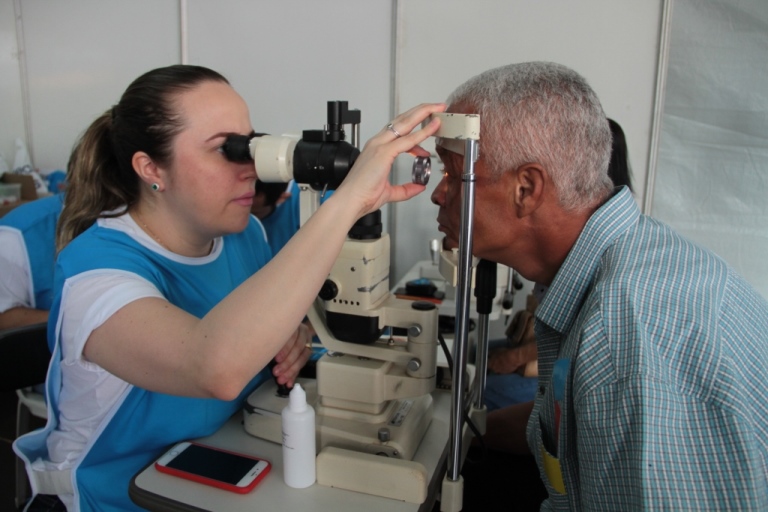 Aluna da Unaerp realiza exame de vista em paciente durante o Mutirão do Diabetes