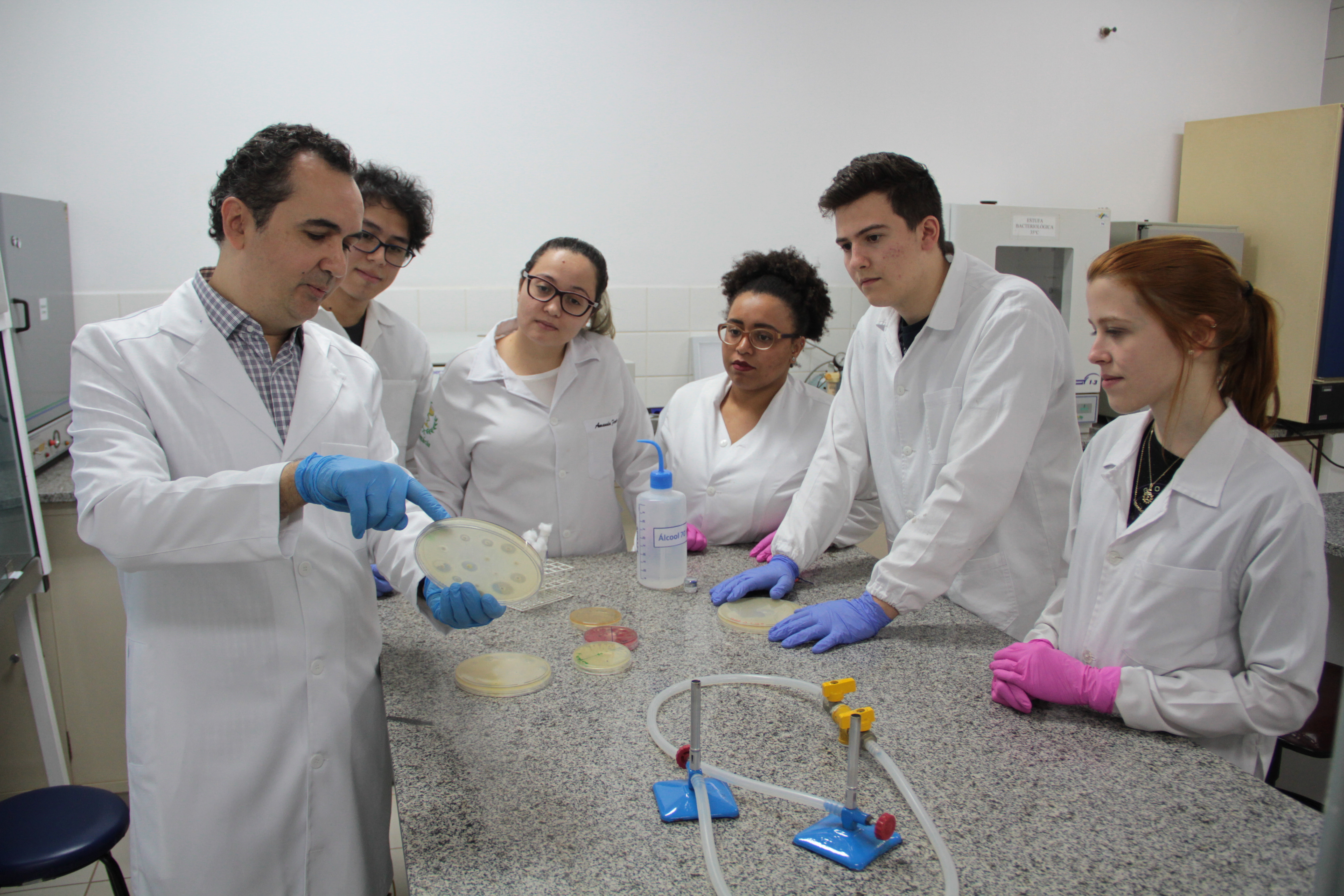 Professor André Pitondo da Silva e alunos no Laboratório da Unaerp