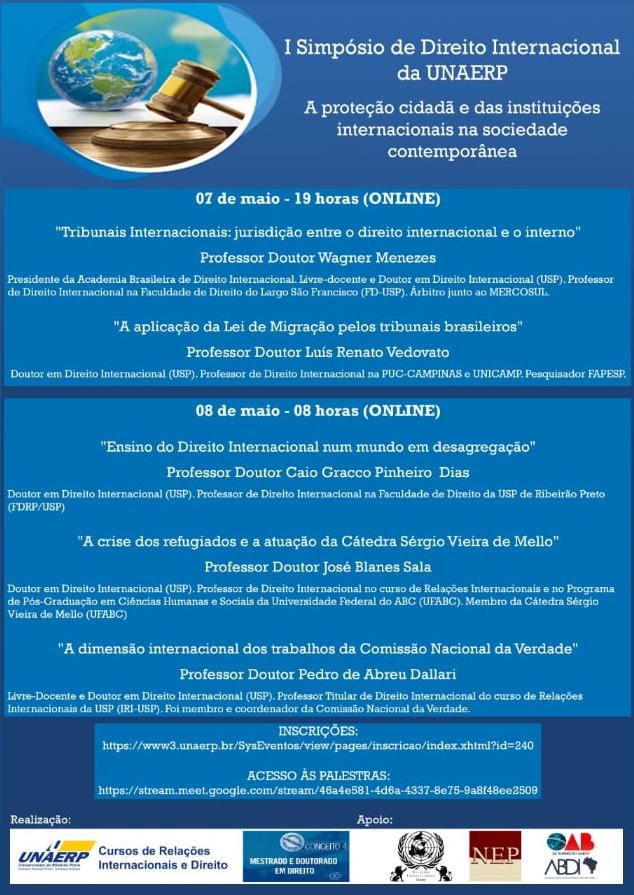 As inscrições para o I Simpósio de Direito Internacional da Unaerp, que terá como tema "A proteção cidadã e das instituições internacionais na sociedade contemporânea", estão abertas e podem ser feitas clicando aqui.