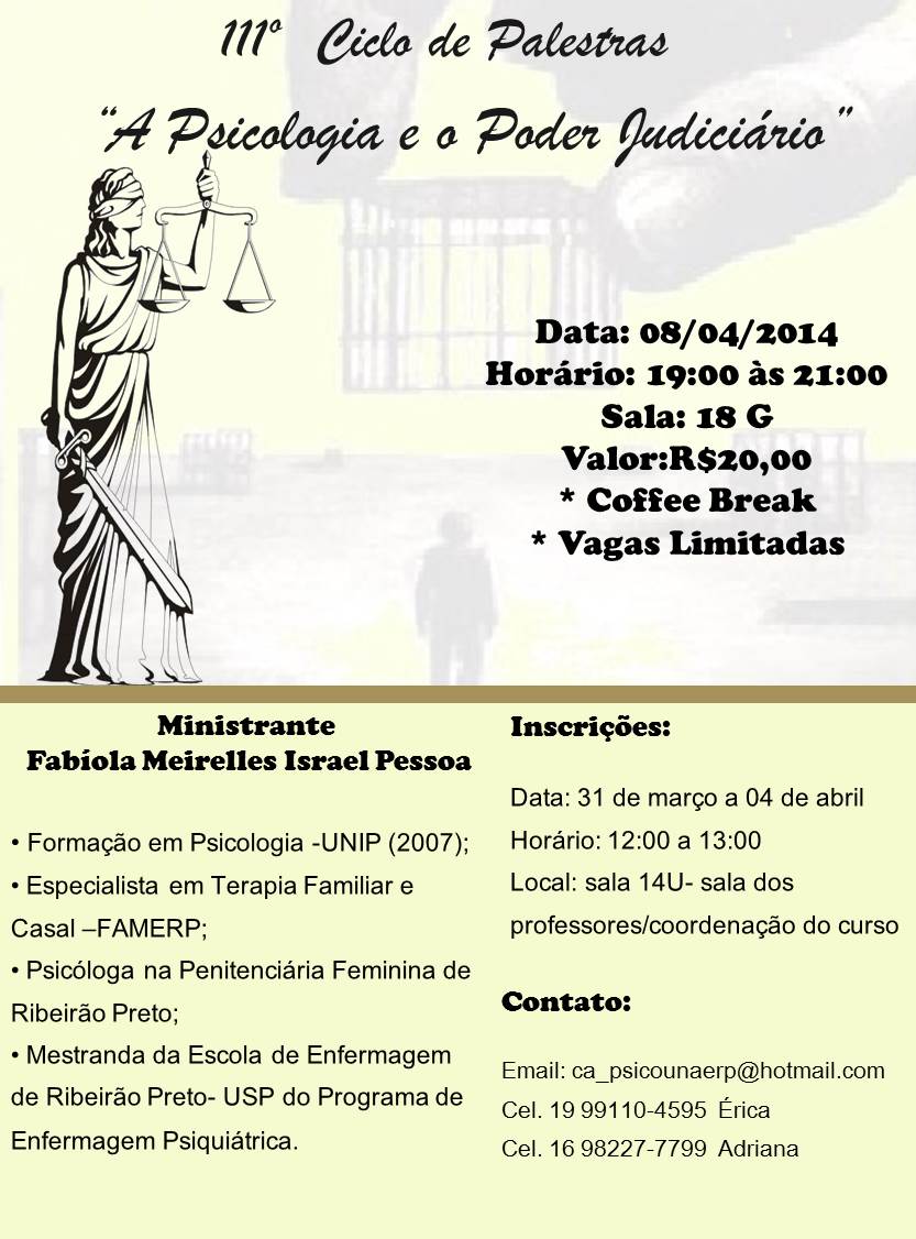 Dando continuidade ao 111º Ciclo de Palestras, o curso de psicologia da Unaerp realiza a palestra “A psicologia e o Poder Judiciário”. O evento acontece no dia 08/04, das 19h às 21h, na sala 18G. As inscrições podem ser feitas de 31 de março a 04 de abril, na sala 14U (sala dos professores - coordenação do curso), das 12h às 13h. A taxa de inscrição é R$ 20,00 e as vagas são limitadas.