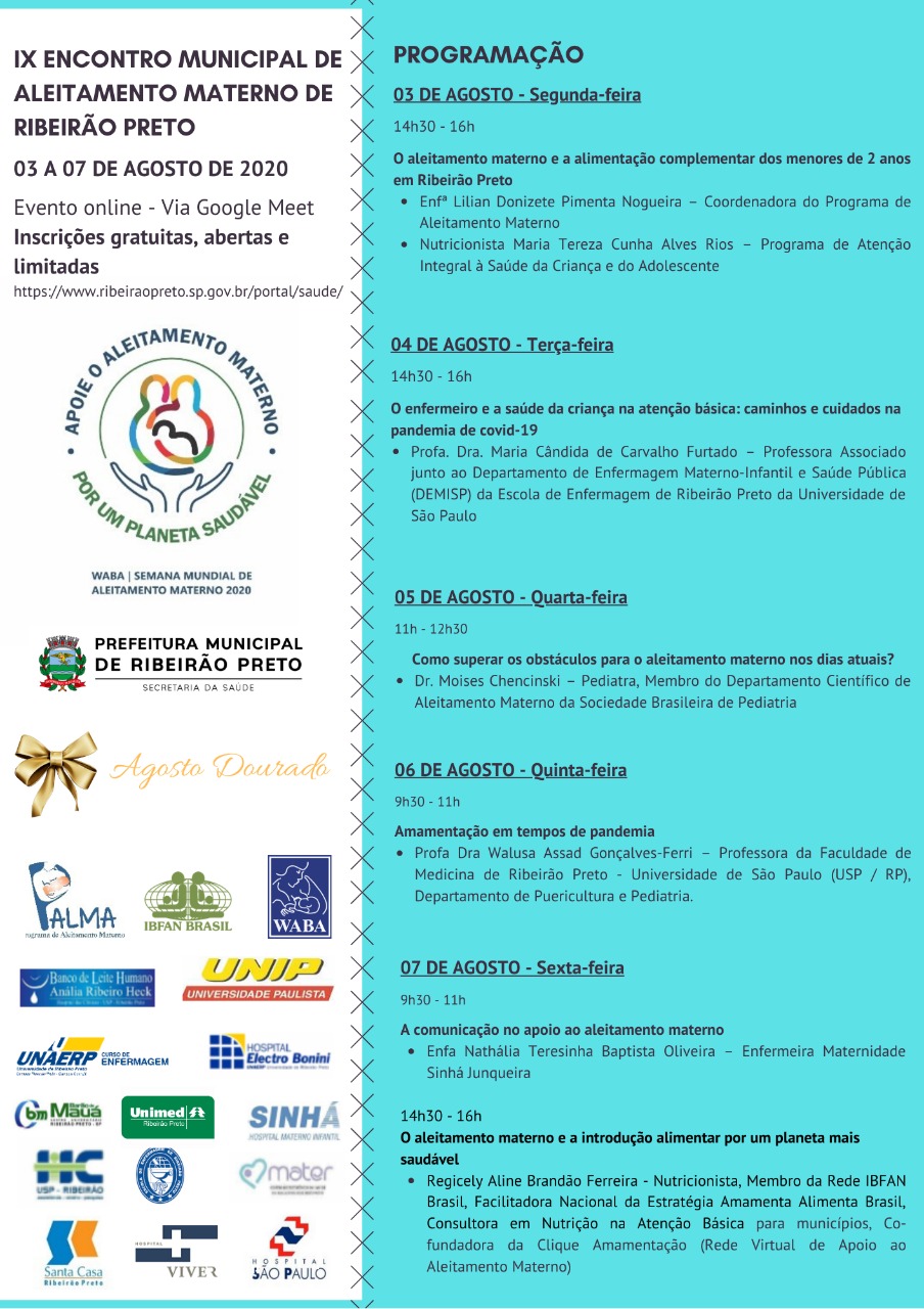 Com o tema mundial “Apoie o aleitamento materno por um planeta saudável”, o objetivo é integrar profissionais de saúde e comunidade para o incentivo ao aleitamento materno. Serão discutidos assuntos relacionados à introdução alimentar por um planeta mais saudável, cuidados à saúde da criança na pandemia de Covid-19, superação dos obstáculos na amamentação e a comunicação no apoio ao aleitamento materno.