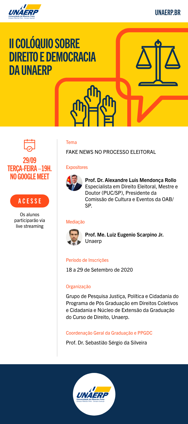 No dia 29 de setembro acontece o II Colóquio de Direito e Democracia da Unaerp, a partir das 19h. Com o tema “Fake News no processo eleitoral”, o evento será totalmente online e os alunos podem se inscrever até o dia 29/09, clicando aqui. Demais interessados podem assistir o evento pelo canal do YouTube da TV Unaerp, clicando aqui.