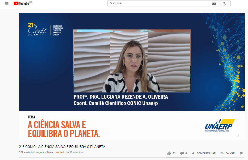 A 21ª edição do Conic - Congresso de Iniciação Científica e Pesquisa da Unaerp, realizada hoje, 11, foi a primeira promovida de forma totalmente on-line e conseguiu superar as expectativas dos organizadores do evento. Mais de 900 pessoas assistiram a transmissão ao vivo da cerimônia de abertura do Congresso pelo canal do YouTube da TV Unaerp e todos os 588 trabalhos selecionados foram apresentados, chegando a ter, no período da manhã, 105 salas virtuais abertas simultaneamente.
