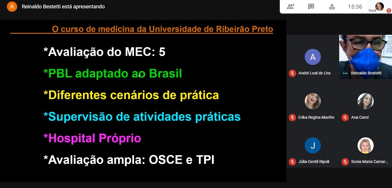 No período da tarde, na sala virtual de Medicina, o coordenador do curso, professor Reinaldo Bulgarelli Bestetti, explicou o método PBL (Problem Based Learn), metodologia ativa de aprendizagem baseada em problemas, destacou que a Unaerp é a única Instituição que usa essa metodologia aplicada ao Brasil; que a taxa de aprovação dos alunos do curso em programas de residência é alta, de 83%; falou sobre a completa infraestrutura de ensino e mais diferenciais da Medicina Unaerp.