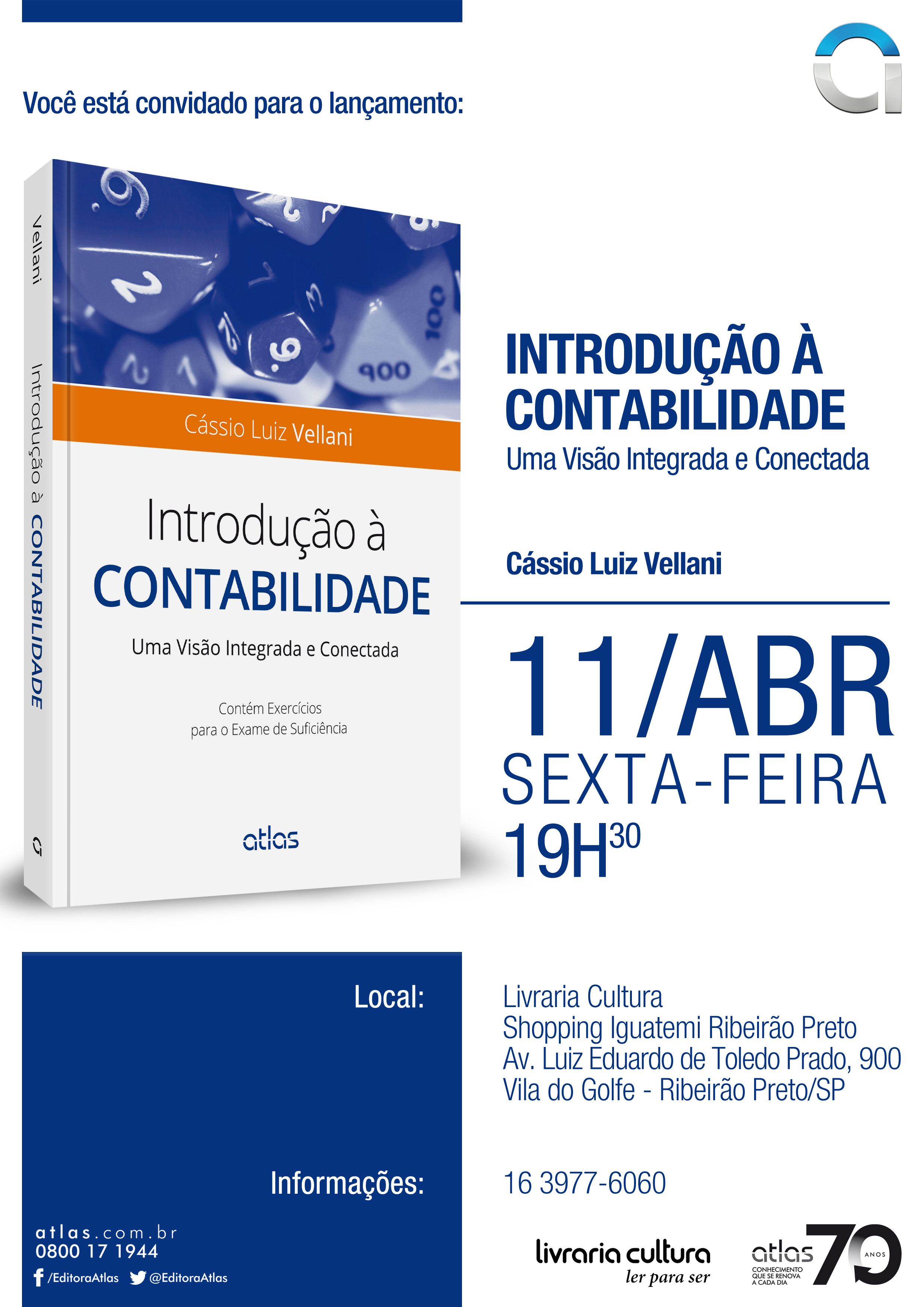 O professor do curso de Administração da Unaerp, Cássio Luiz Vellani, vai lançar, no dia 11 de abril (sexta-feira), o livro Introdução à Contabilidade - Uma visão integrada e Conectada. O evento acontece a partir das 19h30, na Livraria Cultura do Shopping Iguatemi Ribeirão Preto, que fica localizado na Avenida Luiz Eduardo de Toledo Prado, 900, Ribeirão Preto, SP.