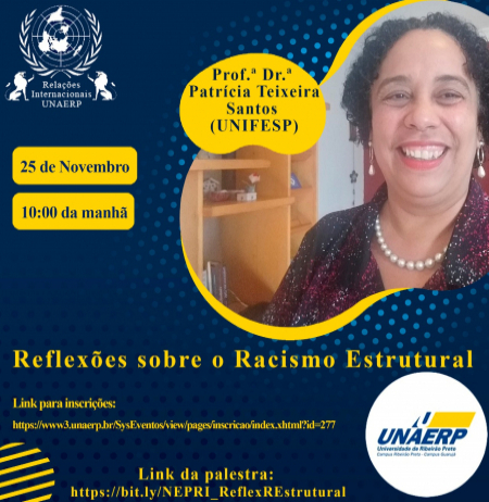 No dia 25 de novembro, às 10h, será realizada a palestra “Reflexões sobre o Racismo Estrutural", ministrada pela professora da UNIFESP, Patrícia Teixeira Santos. O evento é organizado pelo Núcleo de Estudos e Pesquisas em Relações Internacionais e Comércio Exterior (NEPRI/NECCEX) da Unaerp.