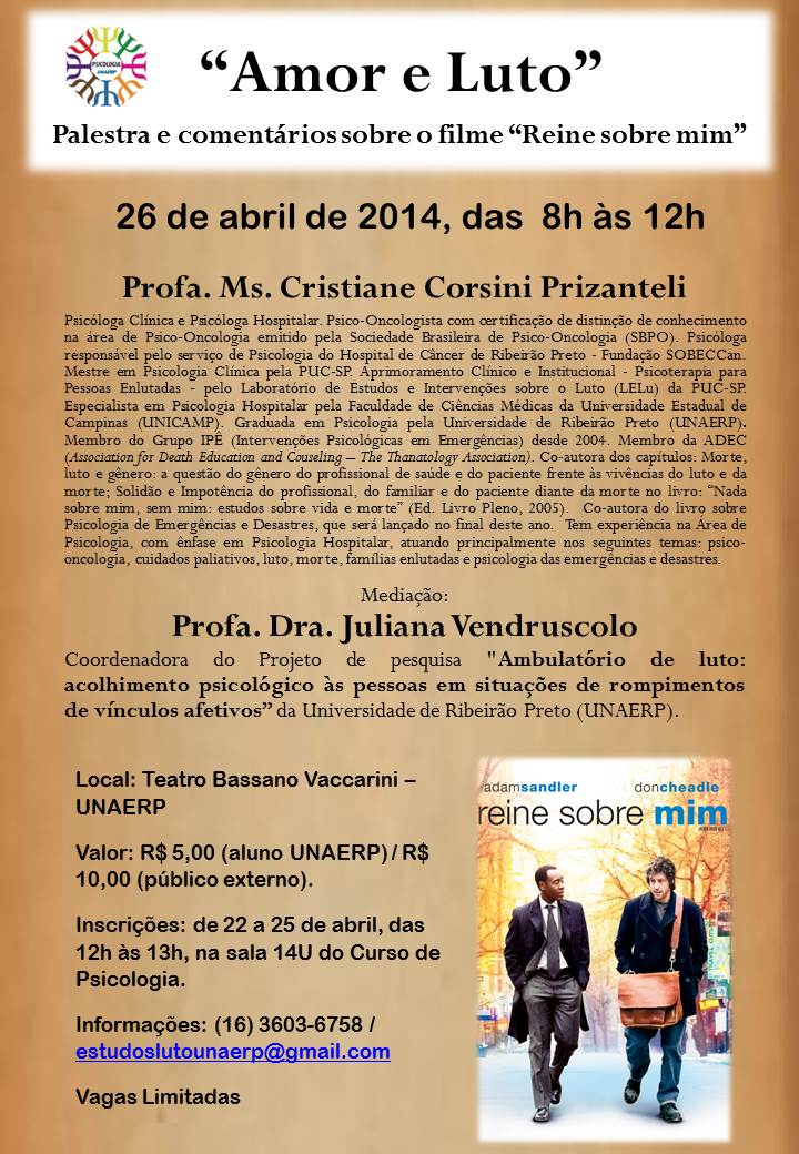 No dia 26 de abril, das 8h às 12h, acontece a palestra "Amor e Luto", que trará comentários sobre o filme "Reine sobre mim". O evento, que acontece no Teatro Bassano Vaccarini, será ministrado pela professora Cristiane Corsini Prizanteli e mediado pela professora Juliana Vendruscolo.