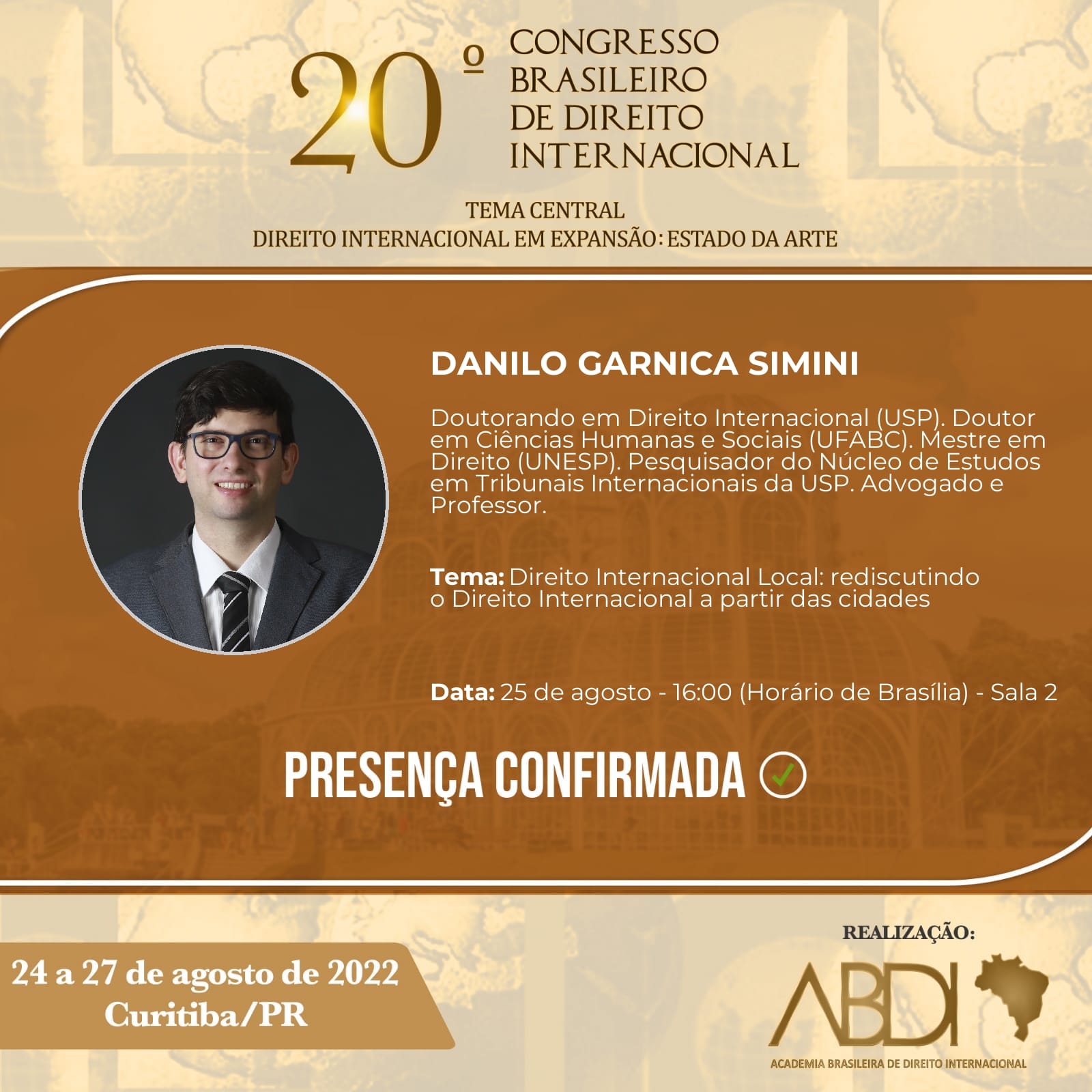 Considerado o evento mais importante da área de Direito Internacional realizado no Brasil, o Congresso traz diversos professores brasileiros e estrangeiros para debater assuntos da área. No dia 25, às 16h, o professor Simini fará a exposição "Direito Internacional Local: rediscutindo o Direito Internacional a partir das cidades", tema relacionado ao objeto de pesquisa de seu segundo doutorado.