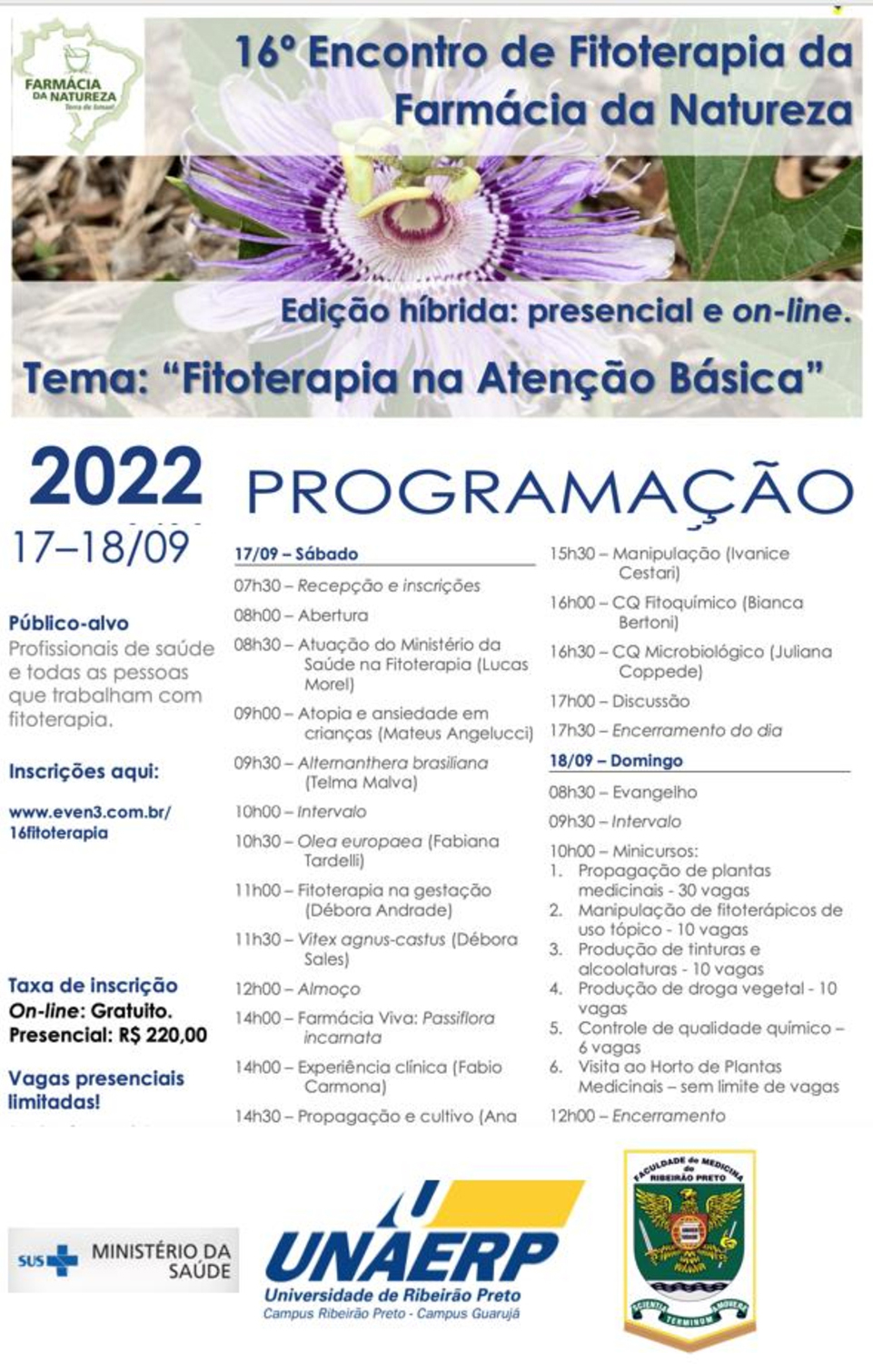 O evento, organizado pela pesquisadora e docente do Programa de Mestrado e Doutorado em Biotecnologia da Unaerp, professora Ana Maria Soares Pereira, é voltado para profissionais da área da saúde e da fitoterapia. Para participar presencialmente, os interessados devem pagar uma taxa de inscrição de R$ 220,00 e as vagas são limitadas. Já a modalidade on-line é gratuita.
