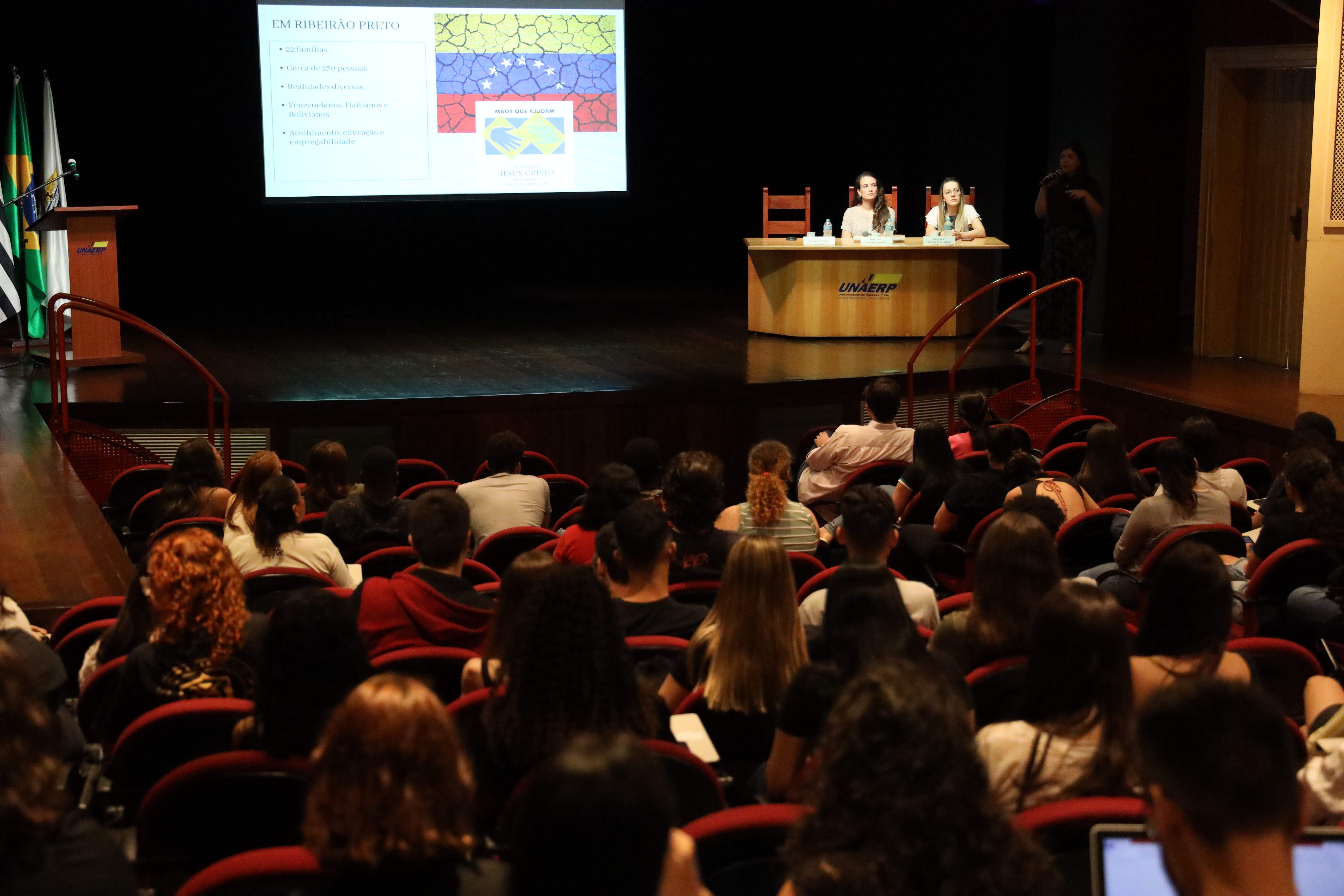O curso de Relações Internacionais realizou, na última quarta-feira (29), uma aula magna com tema “Os desafios das políticas públicas para refugiados em Ribeirão Preto”, ministrada por Ana Laura Pantoni, no Teatro Bassano Vaccarini. O evento contou ainda com a participação de alunos do curso de Direito.