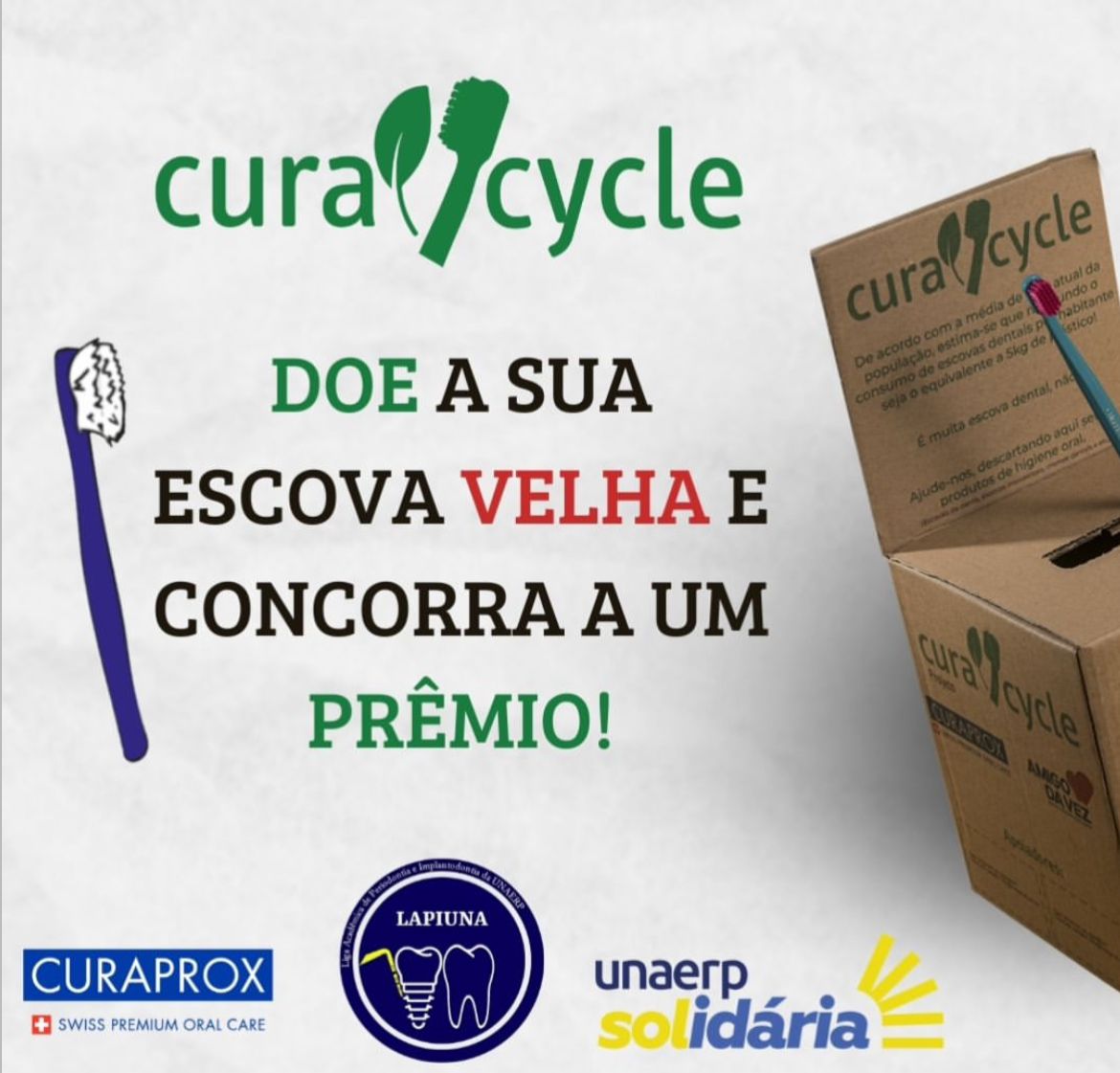 Durante o evento “Unaerp Solidária”, a Liga Acadêmica de Periodontia e Implantodontia (LAPIUNA), do curso de Odontologia da Unaerp, em parceria com a empresa Curaprox, realizam a campanha “Curacycle”, que visa a arrecadação de escovas de dente usadas para reciclagem. A ação ocorrerá nos dias 24 e 25 de maio, na praça Carlos Gomes.