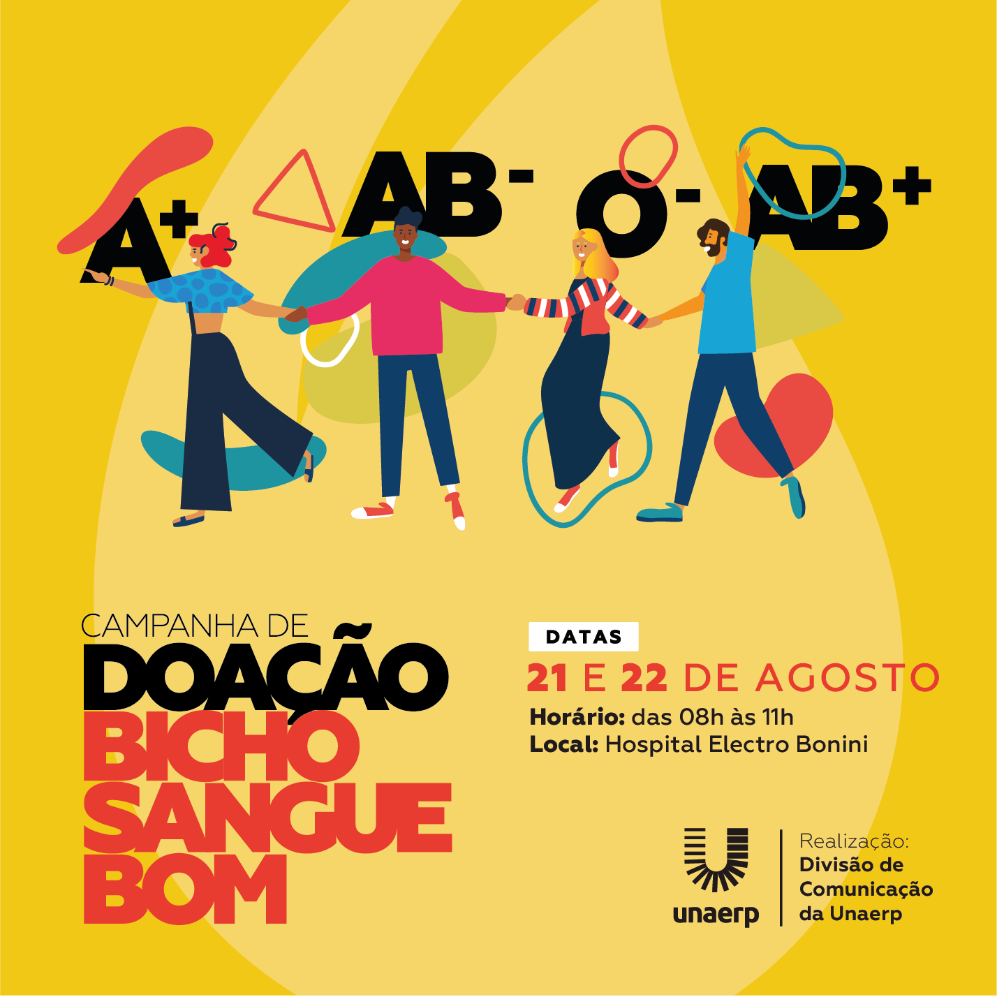 A Universidade de Ribeirão Preto - Unaerp promove, nos dias 21 e 22 de agosto, a tradicional campanha de doação de sangue “Bicho Sangue Bom”. Realizada em parceria com o Hemocentro de Ribeirão Preto, a ação integra as atividades do Programa de Acolhimento e Integração Calouro e Veterano promovido pela Universidade para coibir a realização de trotes violentos durante a recepção de início às aulas, além de incentivar o espírito solidário entre o estudantes.