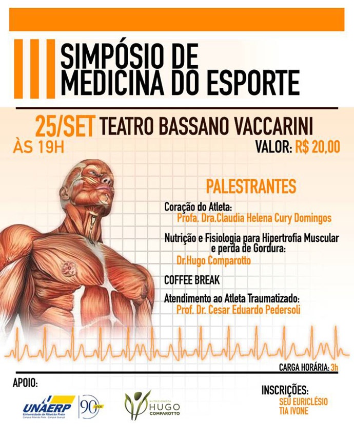 A Associação Atlética Acadêmica Jarbas Nogueira, com o apoio da Unaerp, realiza no próximo dia 25 de setembro o III Simpósio de Medicina do Esporte, às 19h no Teatro Bassano Vaccarini.