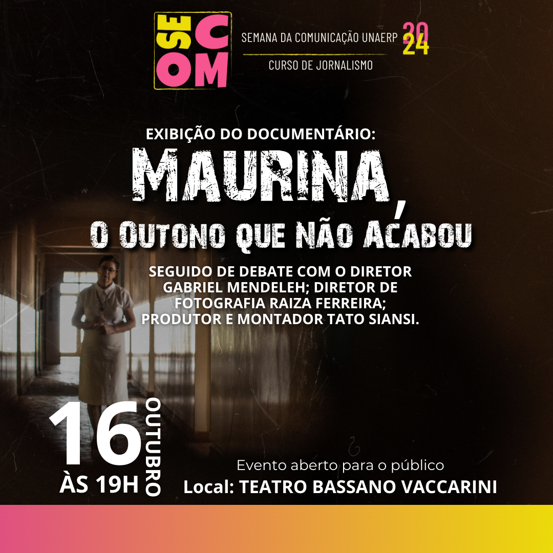 A Semana de Comunicação, promovida pelos cursos de Jornalismo e Publicidade e Propaganda, apresenta o documentário “Maurina, O Outono que Não Acabou”. Produzido pela Kauzare Filmes, com direção de Gabriel Mendeleh, o filme será exibido nesta quarta-feira, 16 de outubro, no Teatro Bassano Vaccarini, a partir das 19 horas. A programação é gratuita e aberta ao público, sem necessidade de inscrição.