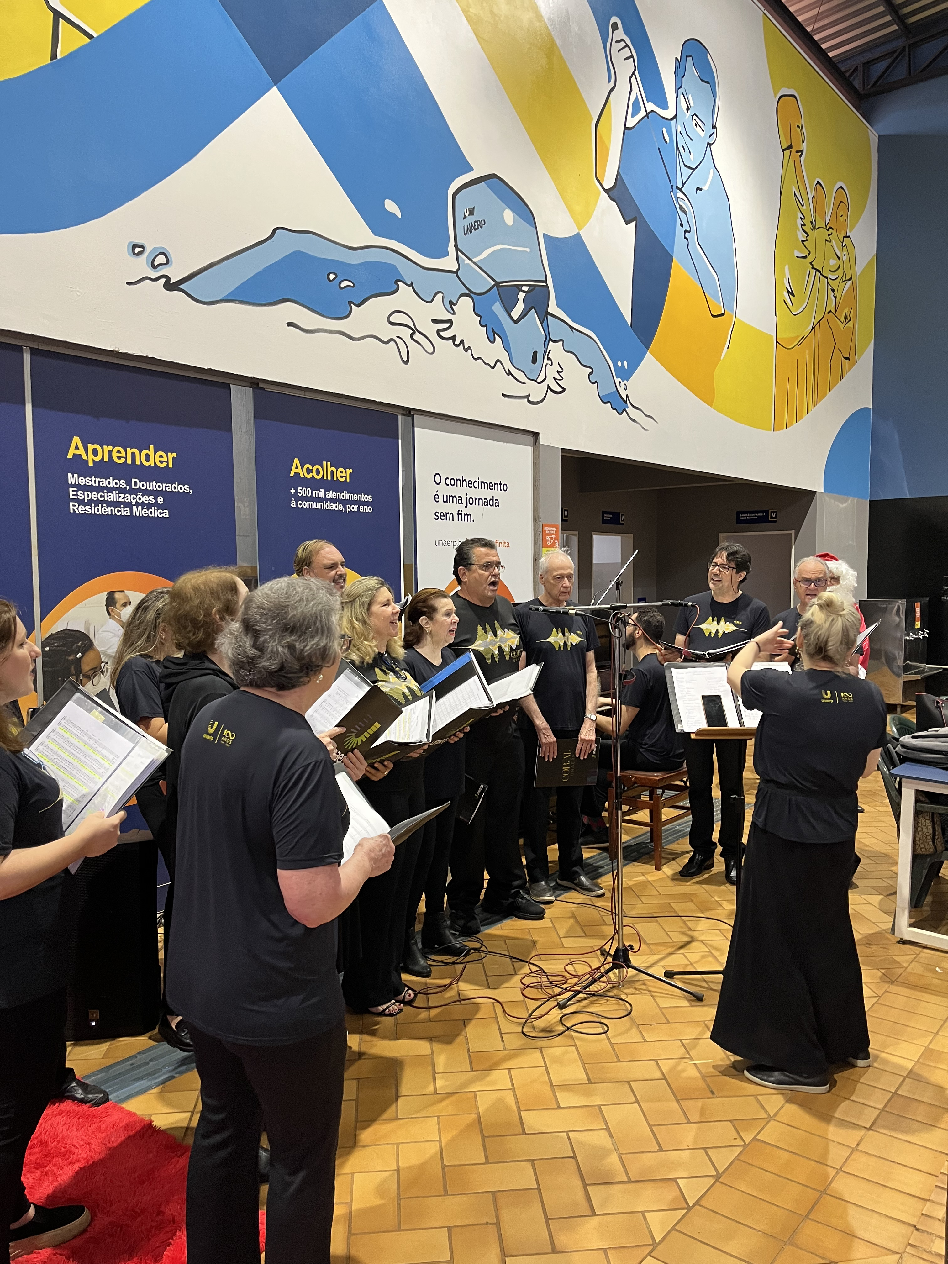 O ano de 2024 foi repleto de celebrações em comemoração ao centenário da Associação de Ensino de Ribeirão Preto - AERP/UNAERP. Para encerrar esse ano histórico com chave de ouro, a Universidade promoveu ainda a tradicional distribuição de brindes de Natal aos colaboradores e docentes da Instituição, nos dias 3, 4 e 5 de dezembro. O evento, realizado no Centro de Convivência, contou com apresentação de Concerto de Natal do Coral da UNAERP e a presença do Papai Noel.