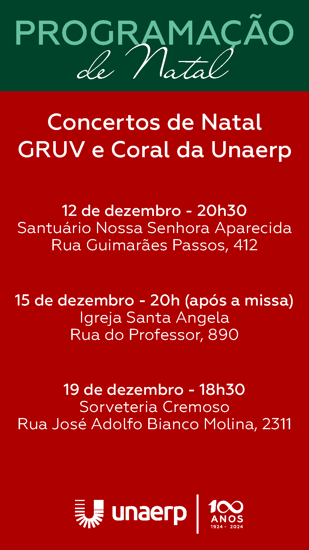 Durante o mês de dezembro, o Coral da Unaerp e o Grupo Universitário Vocal (GRUV) promovem concertos de Natal, gratuitos e abertos ao público. Confira as próximas datas do cronograma de programação: