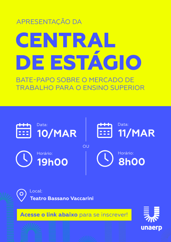 Nos dias 10 e 11 de março, a Unaerp promove, no Teatro Bassano Vaccarini, uma palestra para apresentação da Central de Estágios e do mercado de trabalho no ensino superior, conduzida pela coordenadora da Central, Nathalia Bonini, e Adriel Luis Gennaro, da Alpha Estágios.