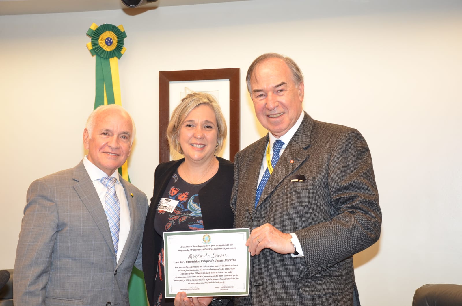 O professor Custódio Pereira, presidente do Fórum Nacional das Instituições Filantrópicas (Fonif), recebeu Moção de Louvor, na Câmara dos Deputados, na quinta-feira, 12 de junho. A vice-presidente da mantenedora da Unaerp, Associação de Ensino de Ribeirão Preto (AERP), Alicia Maria Bonini Ribeiro, esteve na cerimônia representando a Universidade e a AERP.