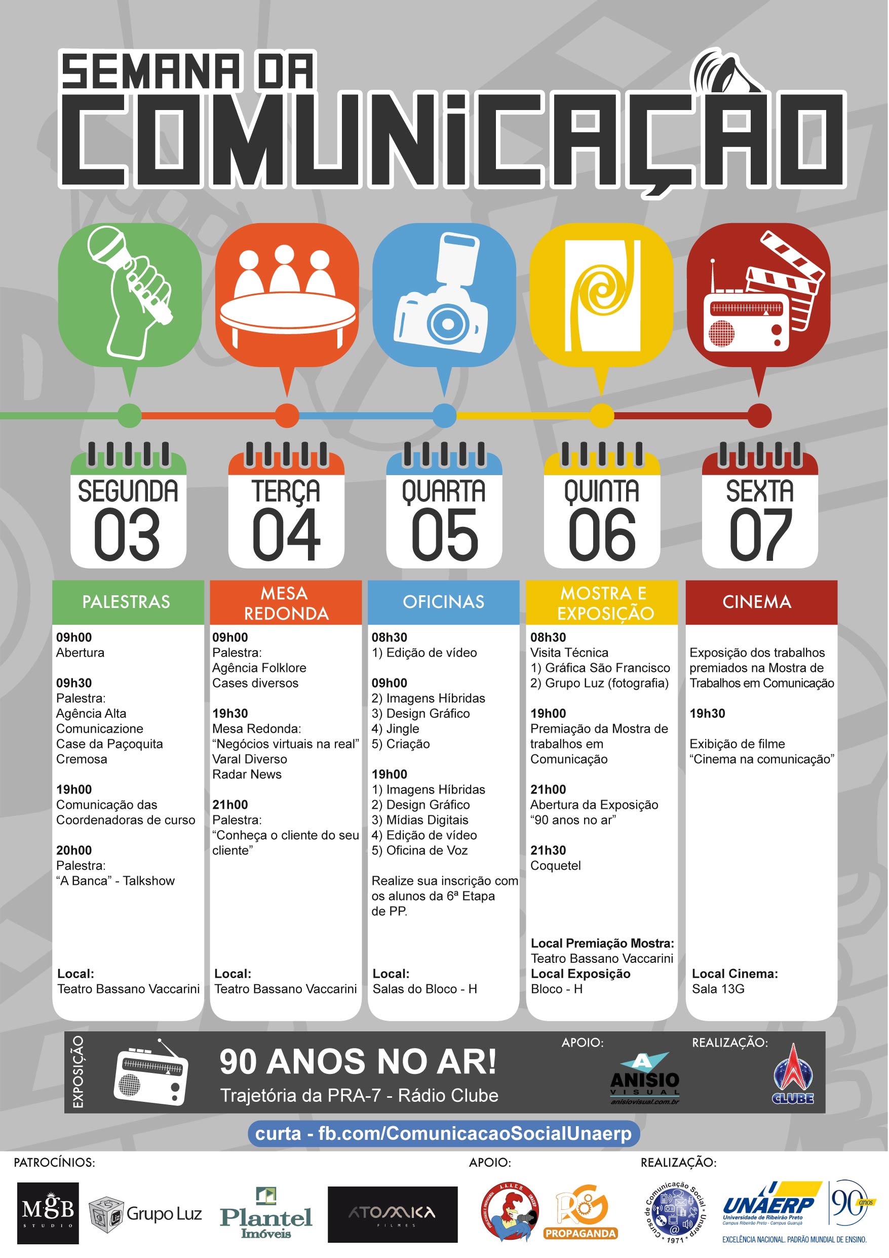 Entre os dias 03 e 07 de novembro, acontece a Semana da Comunicação da Unaerp, no campus Ribeirão. Realizada pelos cursos de Jornalismo e Publicidade e Propaganda, a programação do evento contará com palestras, mesas redondas, oficinas, entre outras atividades. As palestras são abertas ao público, já as oficinas e visitas são restritas para os alunos de Jornalismo e Publicidade e Propaganda da Instituição.