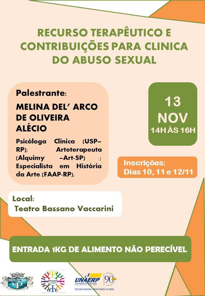 No próximo dia 13, quinta-feira, o curso de Psicologia da Unaerp realizará a palestra "Recurso Terapêutico e Contribuições para a Clínica do Abuso Sexual", no Teatro Bassano Vaccarini.