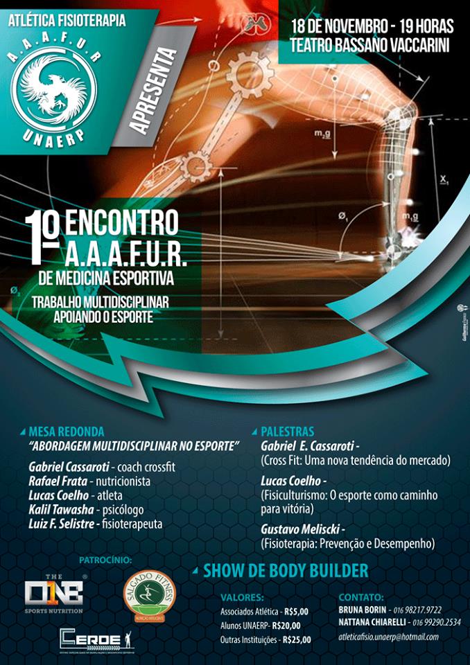 No dia 18, a Atlética Fisioterapia da Unaerp promove o 1º Encontro A.A.A.F.U.R. de Medina Esportiva. O evento acontece no Teatro Bassano Vaccarini a partir das 19h e contará com mesa redonda, onde será debatido o tema “Abordagem Multidisciplinar no Esporte”; palestras com o coach crossfit Gabriel E. Cassaroti, o atleta Lucas Coelho e o fisioterapeuta Gustavo Meliscki, e apresentação de Body Builder.