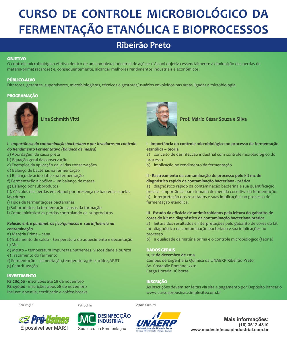 Nos dias 11 e 12 de dezembro acontece na Unaerp o curso de Controle Microbiológico da Fermentação Etanólica e Bioprocessos.