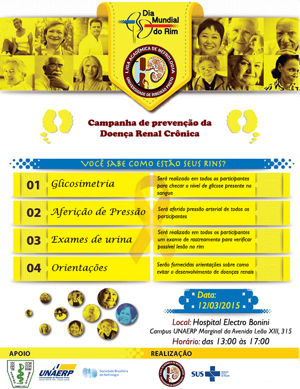 No dia 12 de março, das 13h às 17h, a Liga de Nefrologia do curso de Medicina da Universidade de Ribeirão Preto promove a Campanha de Prevenção da Doença Renal Crônica, a ser realizada no Hospital Electro Bonini, localizado no Campus da Unaerp na Avenida Leão XIII, 315. Na ocasião, serão oferecidos gratuitamente exames de urina, glicosimetria, aferição da pressão arterial e orientações sobre prevenção e tratamento da doença renal crônica - DRC.