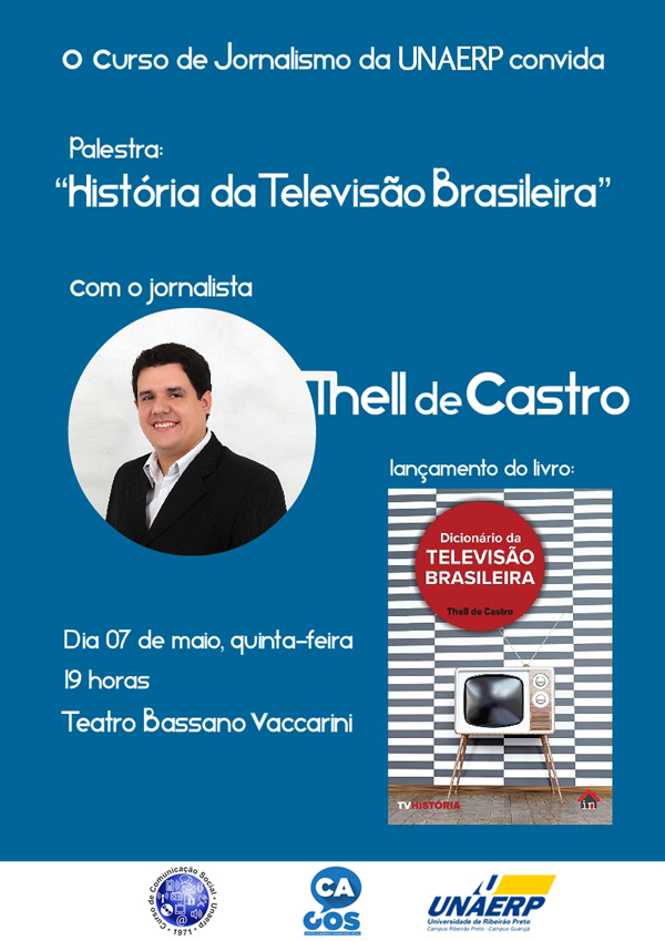 Mais de 65 anos de história de um dos mais importantes veículos de comunicação do Brasil serão sintetizados pelo jornalista Thell de Castro, formado pela Unaerp, na palestra “História da Televisão Brasileira”. Ela será realizada no dia 7 de maio, às 19h, no Teatro Bassano Vaccarini, e será transmitido pela Unaerp FM (www.unaerpfm.com.br).