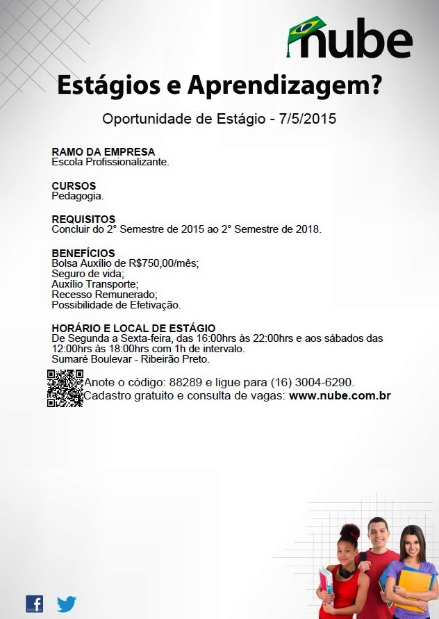 O Núcleo Brasileiro de Estágios (Nube), parceiro da Central de Estágio da Unaerp, divulga vaga de estágio para estudantes de Pedagogia. Confira