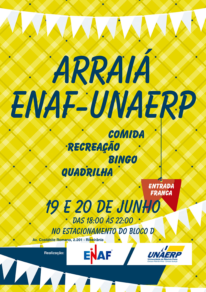 Nos dias 19 e 20 de junho acontece o Arraiá ENAF, no estacionamento no bloco D da Unaerp, das 18h às 22. A entrada é gratuita e o evento conta com recreação, quadrilha, bingo e comida típica.