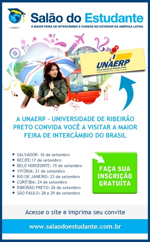 Nesta quinta-feira, 26/09, a Unaerp estará presente no Salão do Estudante, com as equipes do Núcleo de Intercâmbio e do Instituto de Línguas Estrangeiras - ILE que divulgarão as oportunidades de cursos, parcerias internacionais, além de orientações aos alunos sobre como ingressar no intercâmbio acadêmico.