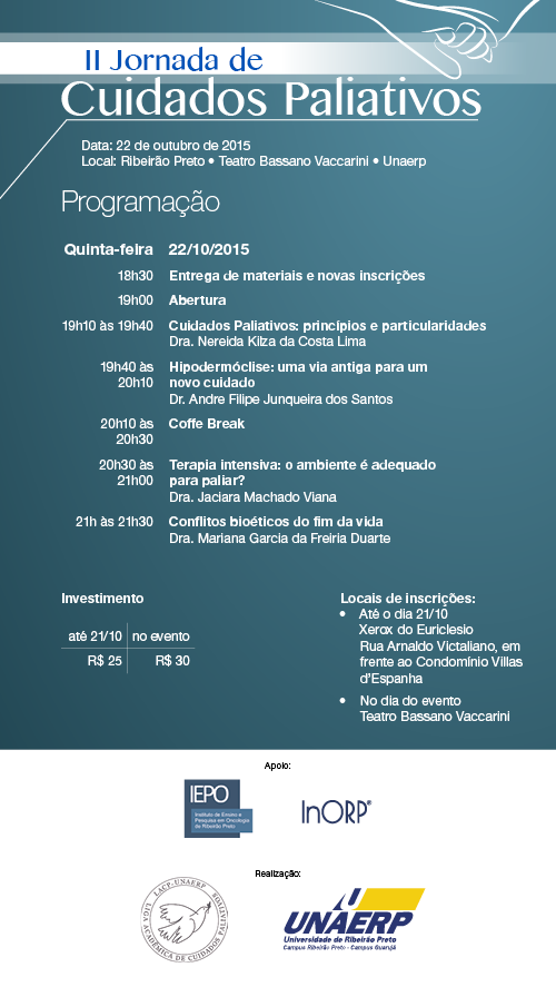 A II Jornada de Cuidados Paliativos da Unaerp será realizada no dia 22 de outubro, a partir das 18h30, no Teatro Bassano Vaccarini. Hipodermóclise, terapia intensiva, conflitos bioéticos e os princípios e as particularidades dos cuidados paliativos, serão os temas abordados no evento.
