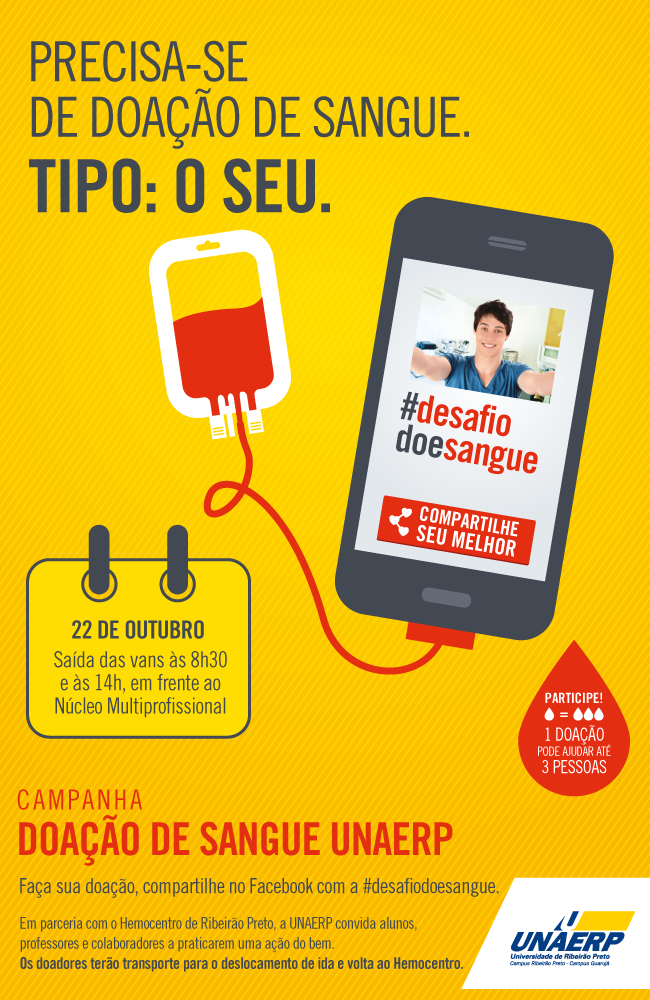 Se você é aluno, professor ou colaborador da Unaerp participe da campanha de Doação de Sangue 2015. Faça sua doação, compartilhe no Facebook com a #desafiodoesangue.