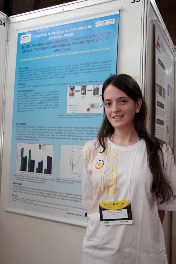 Estudante de Ciências Biológicas, Giovanna Mamesso Di Constanzo, apresentou pesquisa sobre os efeitos inflamatórios oriundos da poluição atmosférica, que desenvolve pela Faculdade de Medicina da USP de Ribeirão Preto (FMRP). "A poluição atmosférica está presente no ar que respiramos e no estudo mostramos que é um fator de risco ao qual toda população está exposta e pode ser muito prejudicial. Se pudermos criar medidas para evitar as emissões de gases e materiais que contribuam para essa poluição vamos acarretar melhoras significativas na saúde da população. É uma grande oportunidade apresentar o trabalho para mostrar para as pessoas a importância da pesquisa que estamos desenvolvendo", conta.
