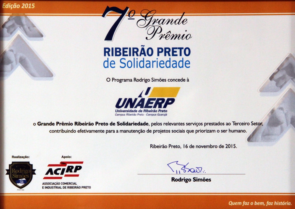 A Unaerp foi agraciada, pela sétima vez, com o Prêmio Ribeirão Preto de Solidariedade, que homenageia as entidades beneficentes que trabalham com transparência e credibilidade, e empresas que atuam em benefício do Terceiro Setor.