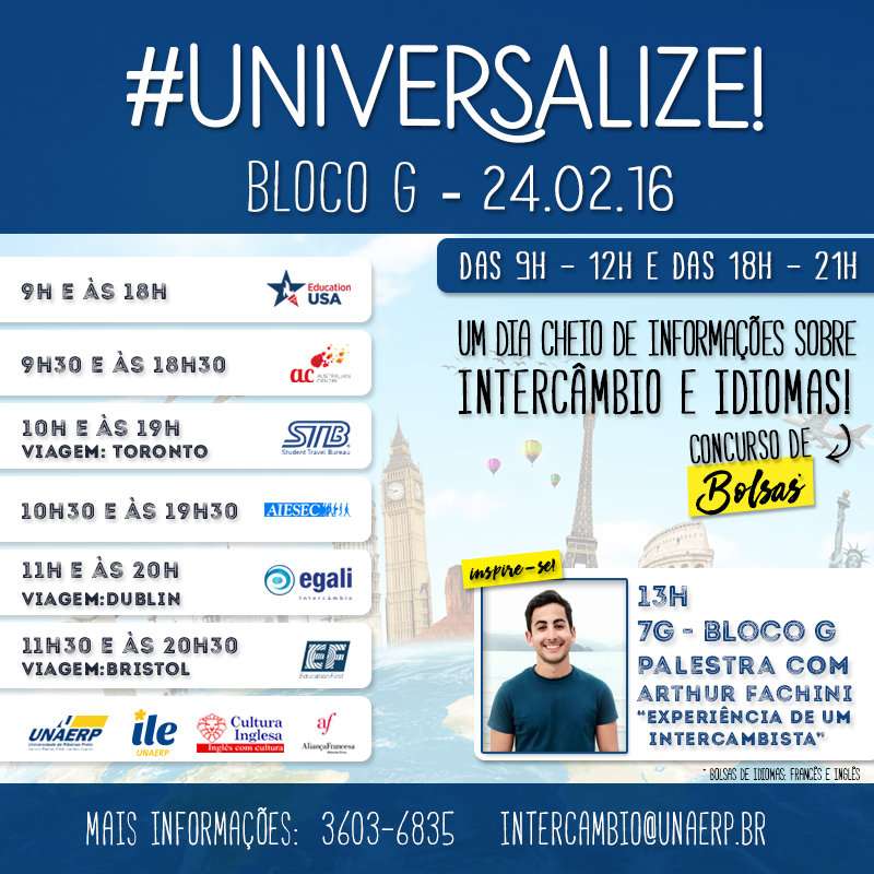 O Núcleo de Intercâmbio da Unaerp promove a segunda edição do evento #UNIVERSALIZE, no dia 24/02 (quarta-feira), em dois horários, das 9h às 12h e das 18h às 21h, em frente ao ILE, entre os blocos G-H.