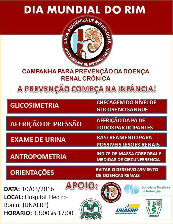 A Liga de Nefrologia do curso de Medicina da Unaerp realizará no próximo dia 10/03 a Campanha para prevenção da doença Renal Crônica, em comemoração ao Dia Mundial do Rim.