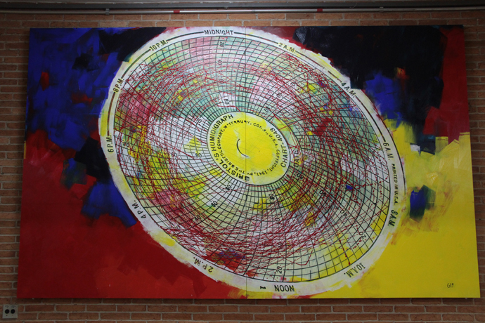 O painel, intutulado Humidigraph, faz referência a um cartão utilizado em cirurgias há mais de 50 anos para medir os sinais vitais do paciente.