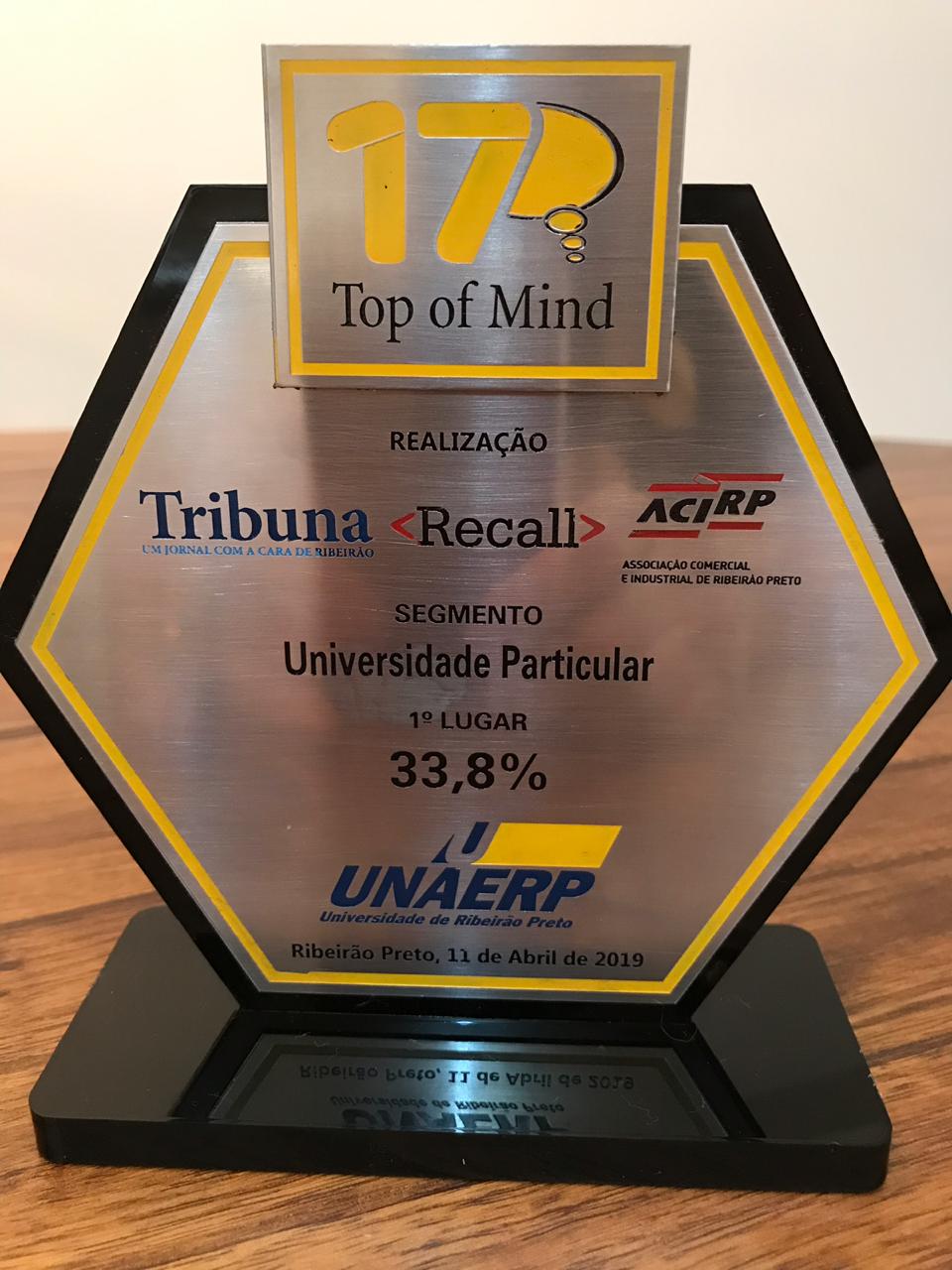 Dezessete vezes Top Of MindA Unaerp recebeu ontem o 17º troféu Top Of Mind atribuído pela pesquisa Tribuna & Recall que identifica as instituições e marcas mais lembradas pela população