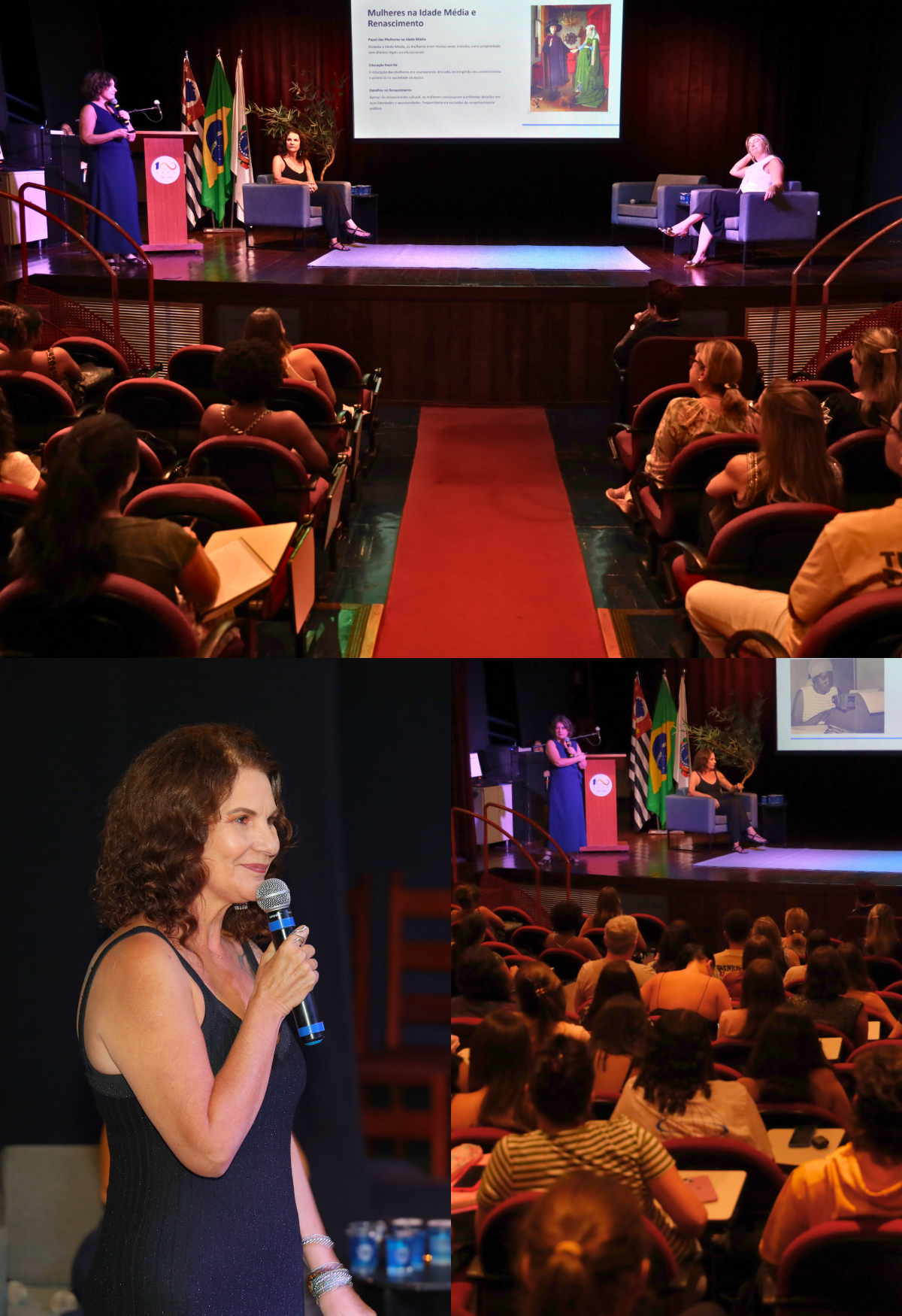 As professoras Leisa Boreli Prizon e Tania Regina Cosci e a ex-delegada Luciana Renesto conduziram o debate no Teatro Bassano Vaccarini